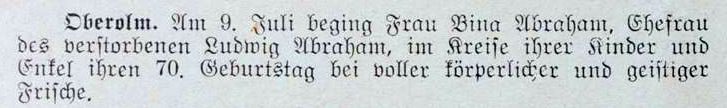Oberolm Israelit 05071928.jpg (23482 Byte)Mitteilung in der Zeitschrift "Der Israelit" vom 5. Juli 1928: "Mainz, 27. Juni (1928). Die Ehefrau des verstorbenen Ludwig Abraham aus Oberolm bei Mainz, Frau Bina Abraham, feiert dieser Tage im Kreise ihrer Kinder und Enkel ihren 70. Geburtstag in voller körperlicher und geistiger Frische."