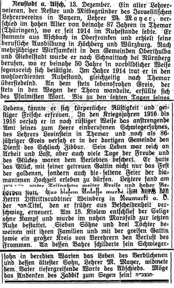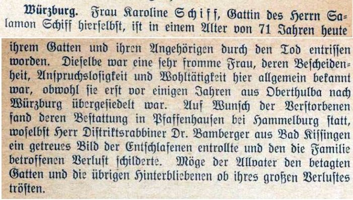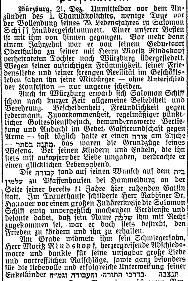 zum Tod von Distriktsrabbiner Seligmann Bär Bamberger vom "einstigen Zögling der