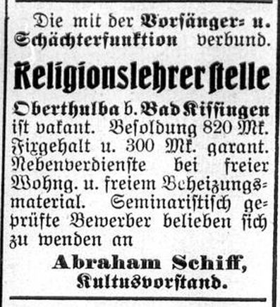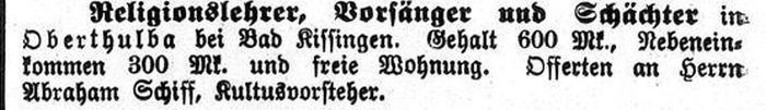 Oberthulba, um 1903 wird Lehrer L. Uhlfelder in Oberthulba genannt (J.