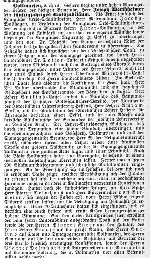 Lehrer Ferdinand Stern in Volkmarsen, später Artur Auerbacher. Die Israelitische