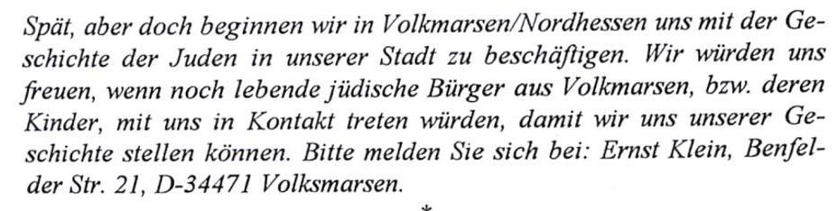 Eines der Vorworte stammt von dem israelischen Politiker Moshe Meron, der sich seinerzeit auch für die Aufnahme diplomatischer Beziehungen zwischen dem Staat Israel und Deutschland einsetzte. Ernst Klein wird am kommenden Sonntag, 4. Dezember, um 16 Uhr in den Räumen der Geschichtswerkstatt im Haus Dr. Bock an der Kasseler Straße aus seinem Buch lesen.