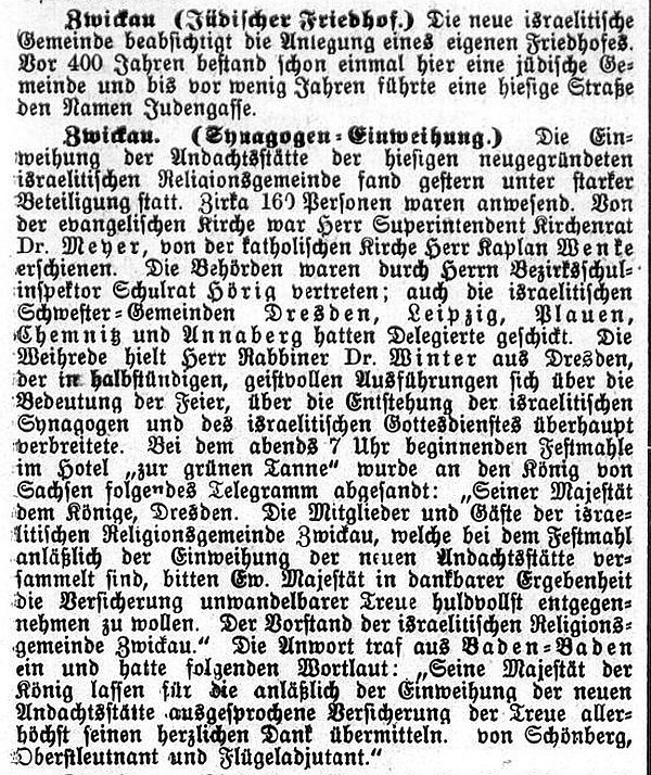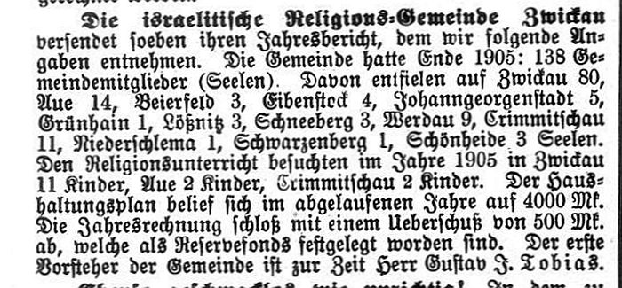 im "Israelitischen Familienblatt" vom 29. Juni 1905: "Zwickau (Jüdischer